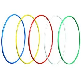 Gymnastics hoops for rhythmic gymnastics. The outer diameter of the hoops is about 89.5 cm and the weight is about 305 g. The round profile is made of plastic with a diameter of about 20 mm.