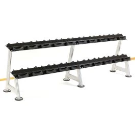 Rack with two shelves and rubber saddles for 10 pairs of dumbbells. Measurements (WxDxH) 250 x 60 x 80 cm.