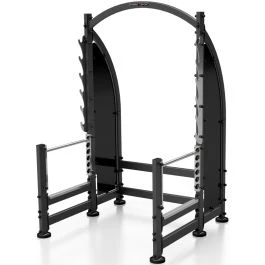 Solid squat rack with 6-position dumbbell rack and side safety bars.