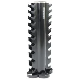 Rack for 10 pairs of chromed dumbbells. Massive steel construction with plastic covered edge protection. Measurement (WxDxH) 40 x 36 x 122 cm. Without dumbbells.